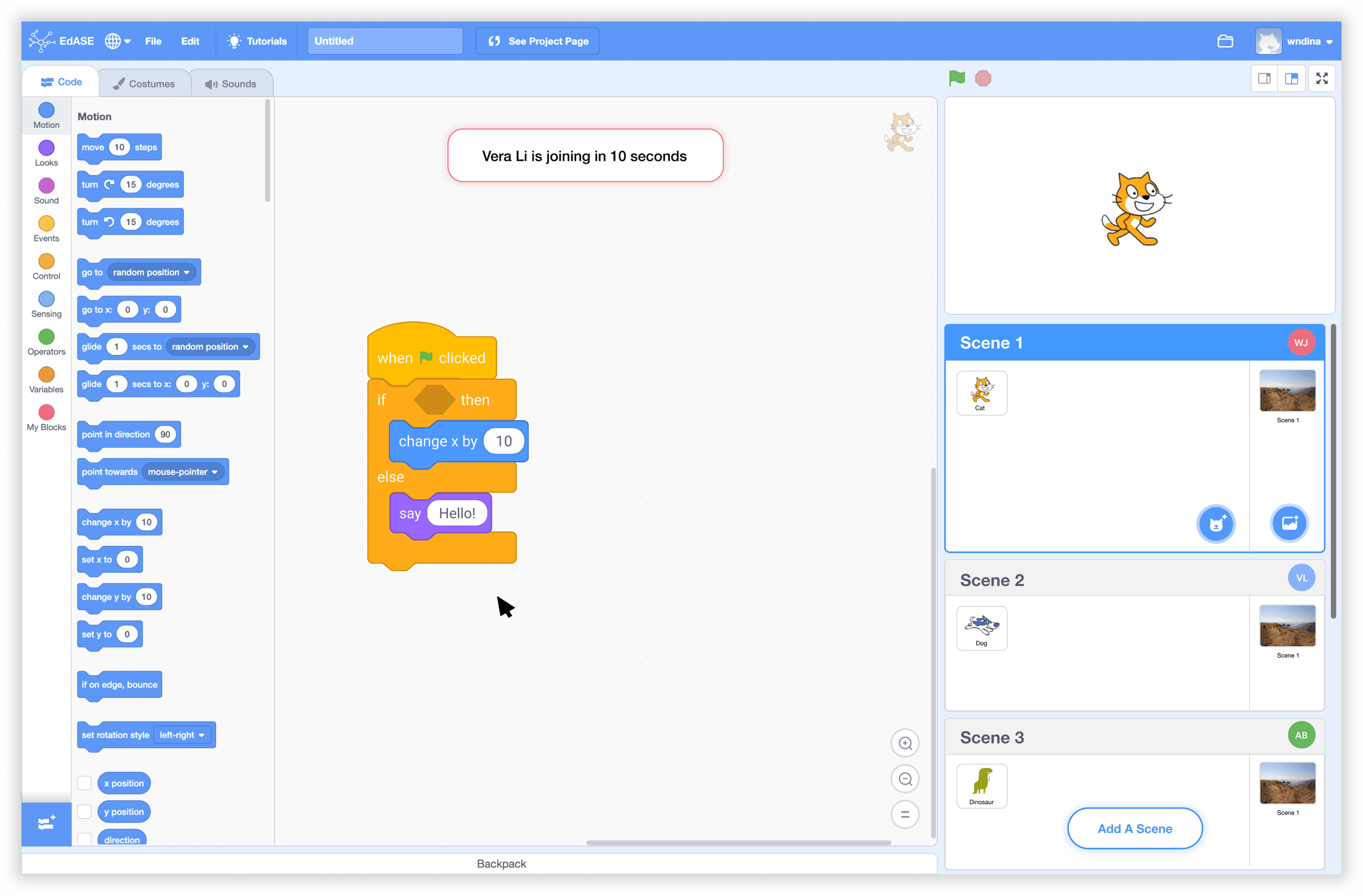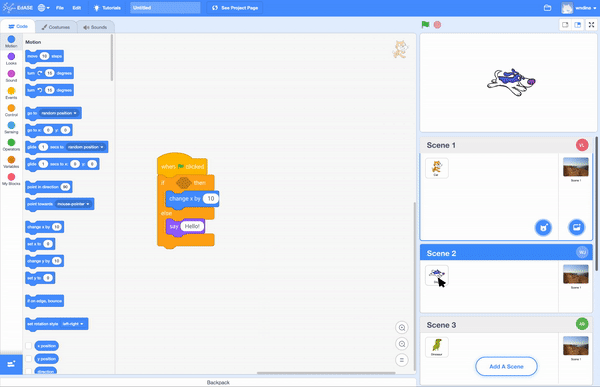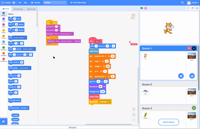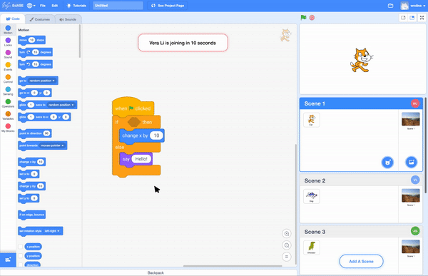 The redesigned iteration version incorporates a new feature called "scenes." In this version, each student has their own independent canvas to develop their code. A scene represents an individual workspace. If students wish to collaborate with others, they can enter another person's scene by clicking on it or by directly dragging their code into the other person's workspace. This redesigned approach offers better organization for students and is also easier to develop for developers.
