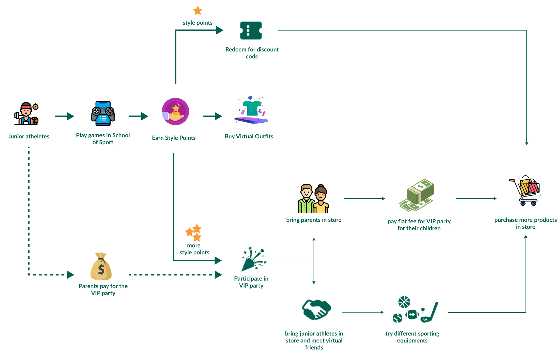 We brainstormed 18 ideas that addressed the pain points uncovered in the insights and narrowed them down: By hosting an in-store VIP party for kids who play DSG’s online game, School of Sport, we can bring these kids and their parents into the physical stores.