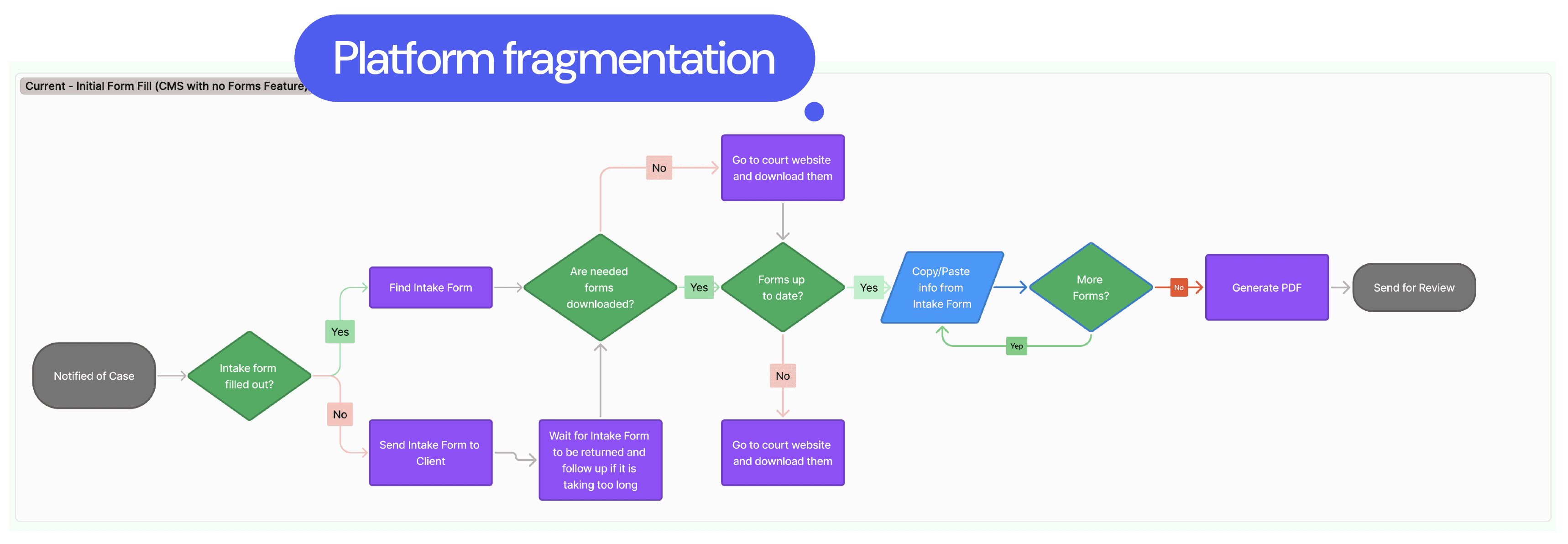 However, the current workflow is overly complex due to a fragmented platform. Legal professionals must manage cases through email, download forms from court websites or local files, manually complete and save them, and email them back to the appropriate recipients. This results in frequent errors, duplicated effort, time loss, and difficulty tracking deadlines.