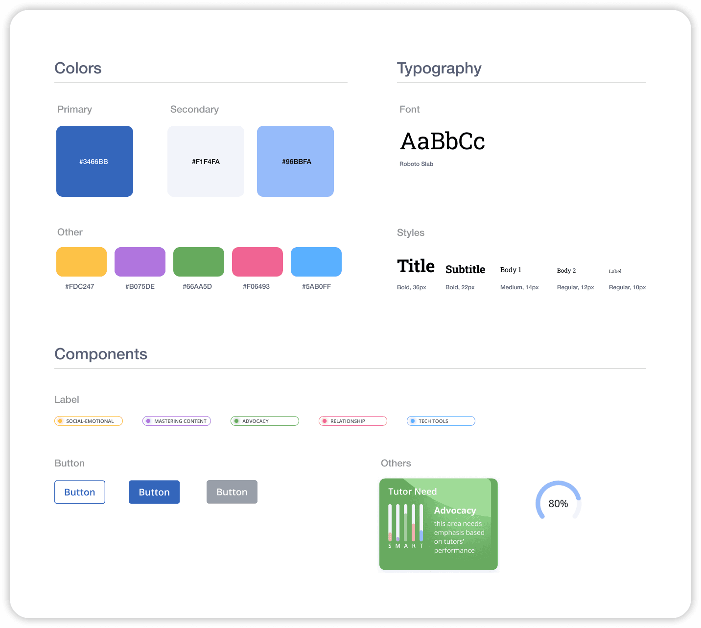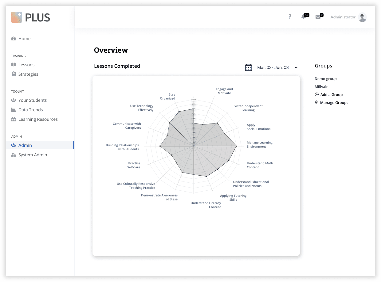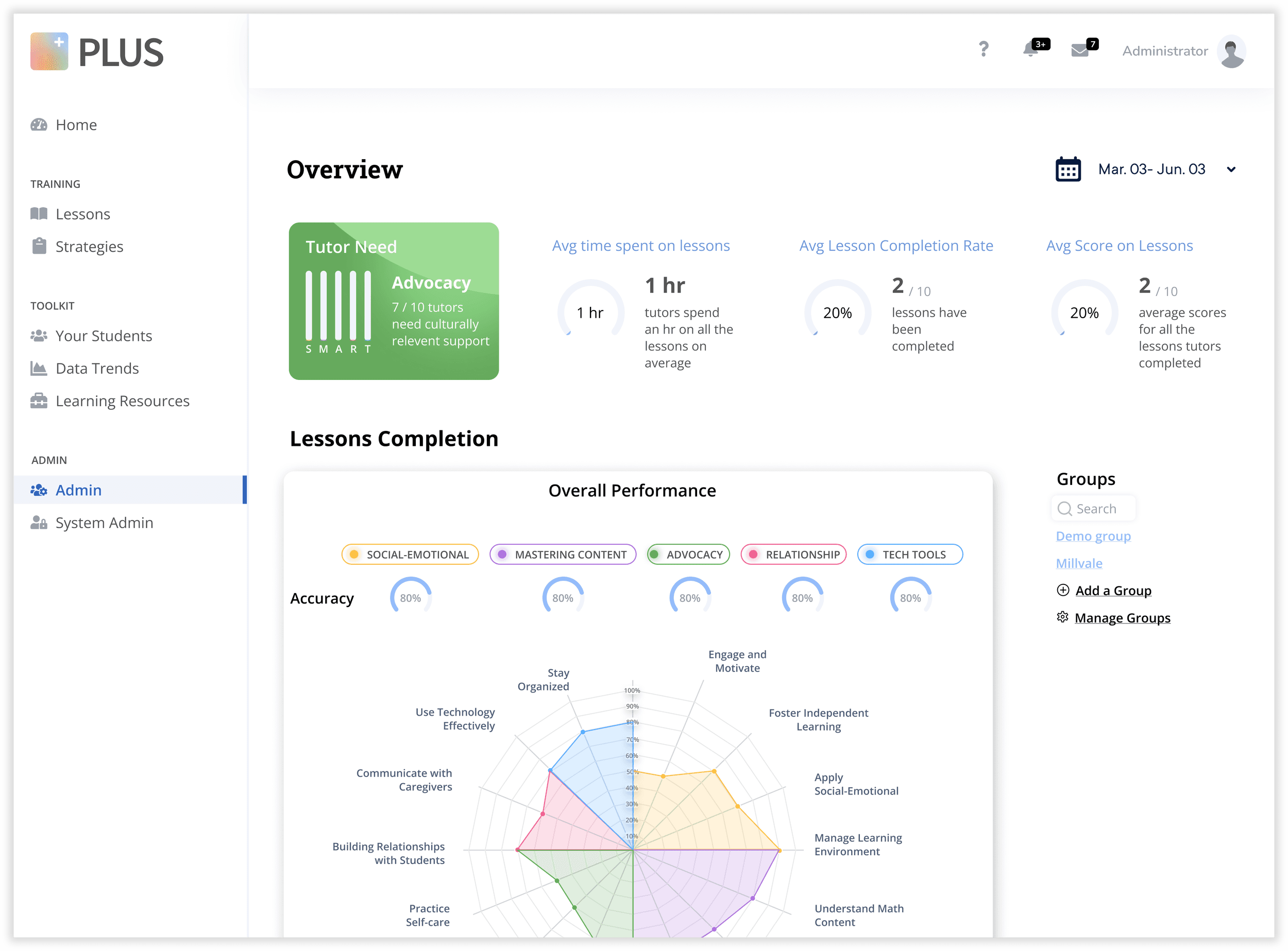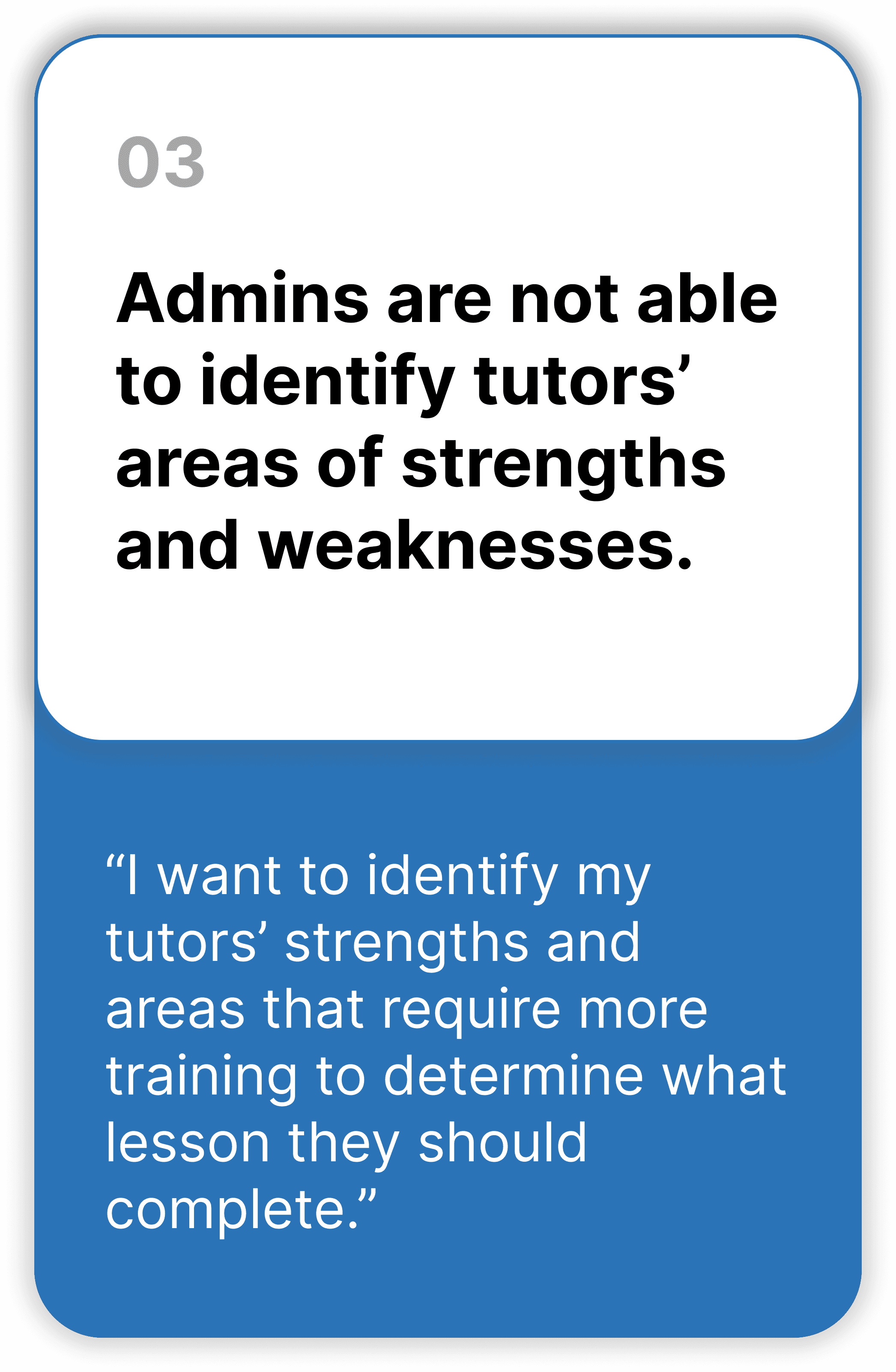 Admins can look at the overall performance of the tutors in terms of which area they need help on, their lesson completion and accuracy rate, and their average time spent on the lessons.