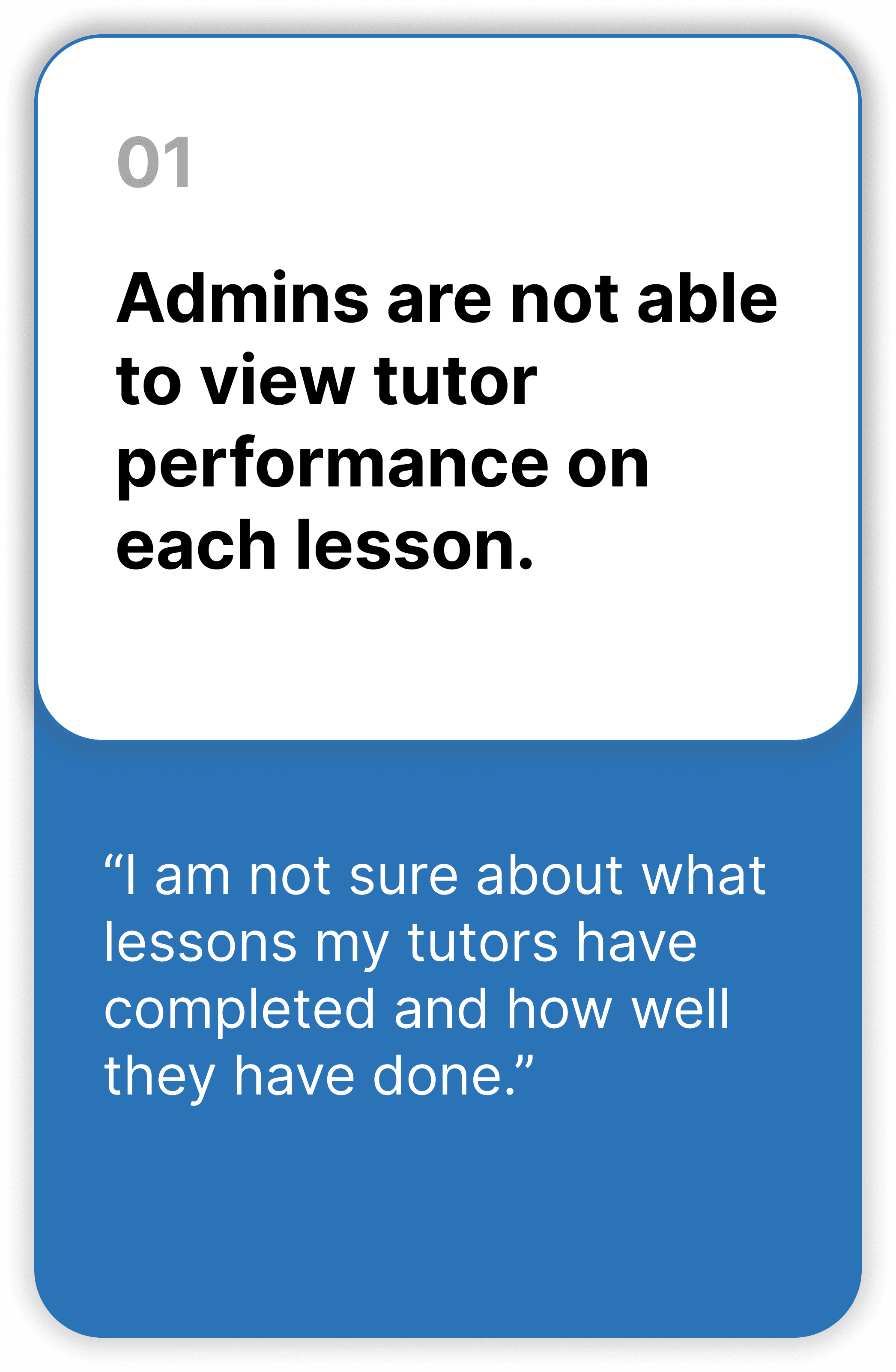 The current admin dashboard does not allow admins to monitor the tutors’ performance efficiently.
