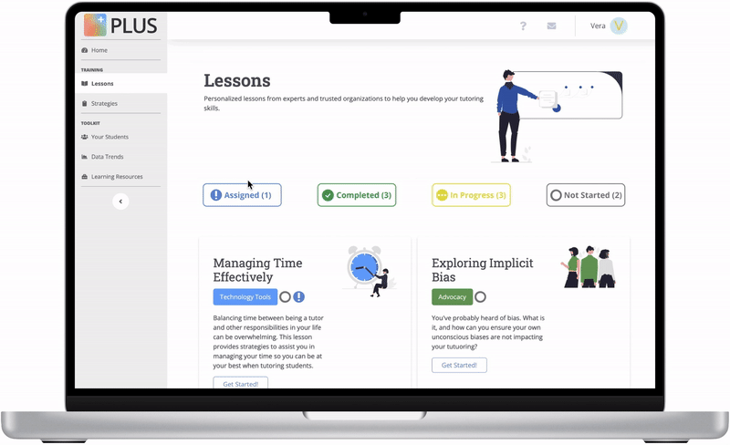 Tutors can view the status for each lesson and filter the lessons by ‘Assigned’, ‘Completed’, ‘In Progress’., or ‘Not Started’.