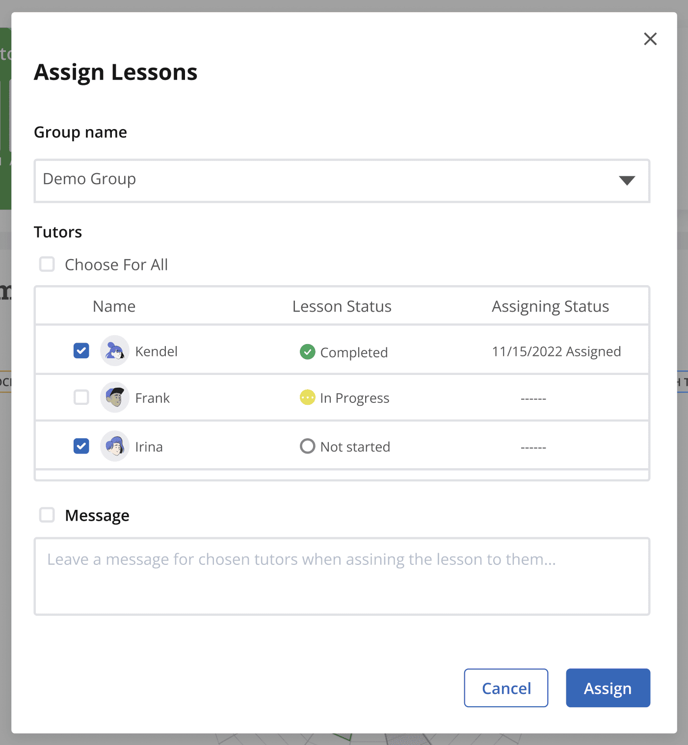 Before the iteration, admins could only choose the tutors to whom lessons were assigned. After implementing the new changes, admins can now view whether or not they have previously assigned lessons to specific tutors. Additionally, they can access information regarding when the lessons were last assigned in order to make informed decisions about whether or not to reassign them. Furthermore, admins are able to attach messages to the assignments to facilitate better communication.